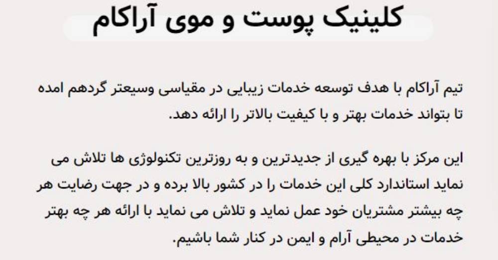مرکز آراکام از سال 1396 و با پشتوانه تجربه ای 5 ساله در زمینه خدمات زیبایی، با رویکردی دانش بنیان و با هدف ارائه خدماتی متفاوت در حوزه پوست، مو، زیبایی فعالیت خود را آغاز نمود. این مرکز با بهره گیری از متخصصین متعهد و مجرب توانسته است ساختار انجام خدمات در حوزه زیبایی را از رویکرد درآمد زایی مطلق به نتیجه گرایی تغییر دهد و هر روزه متعهدانه در نیل این هدف بزرگ در تلاش و گسترش فعالیت های خود می باشد.